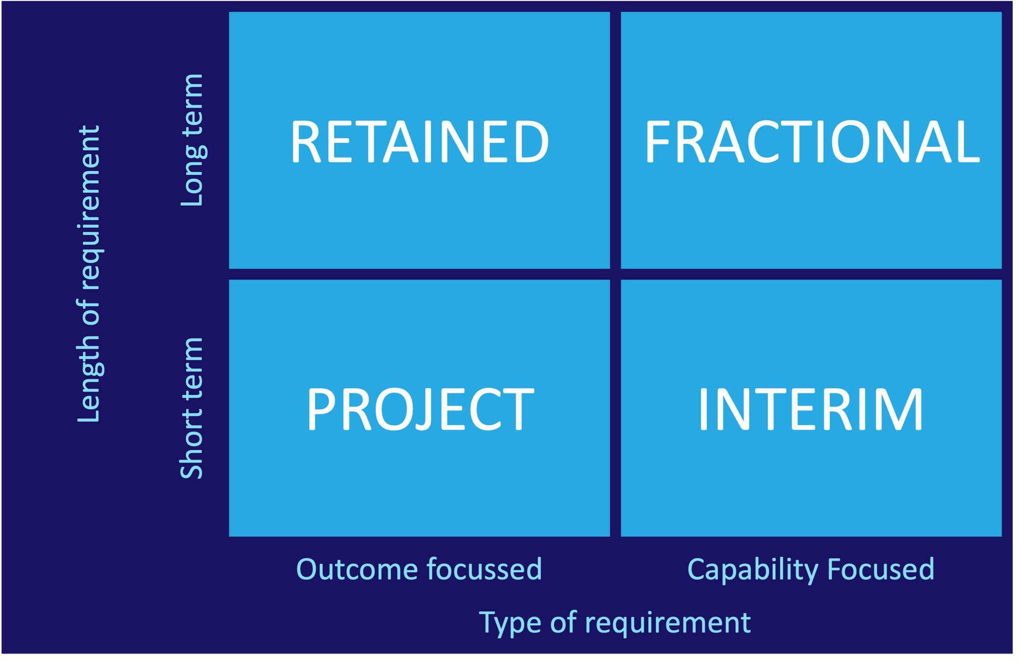 As an ex management consultant, I can’t help but try to draw a picture to help explain something. Here, the ways of working fall into 4 broad different categories depending on whether your need is short term or longer term and also whether you are looking at a particular outcome or capability gap.